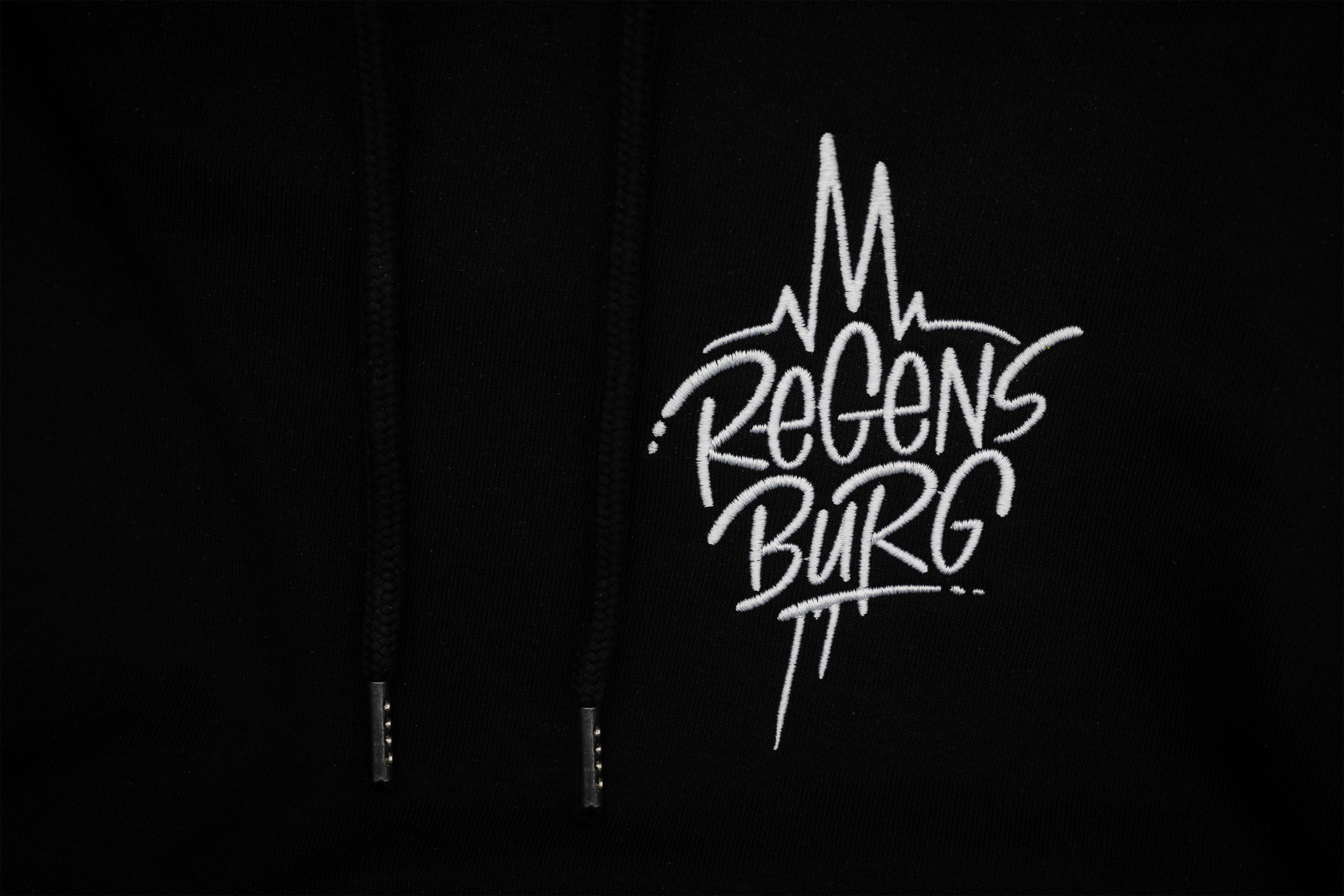 Schwarzer Hoodie 'Regensburg' in normaler Passform. Auf der Brust findet ihr einen schlichten 'Regensburg'-Schriftzug mit einer angedeuteten Skyline unserer Stadt als Stick in weißer Farbe.