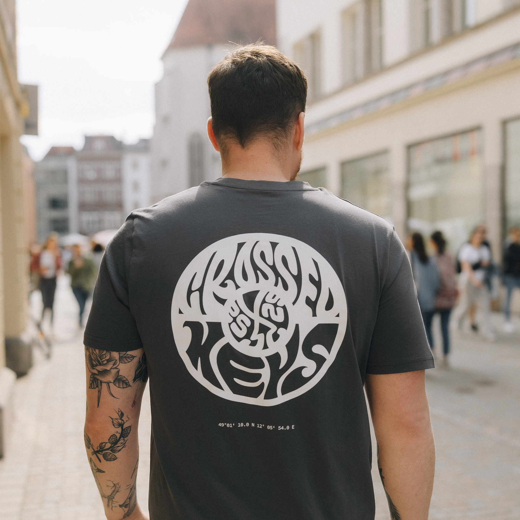 T-Shirt 'Waves' Backprint anthracite in normaler Passform. Als großen Backprint findet ihr unsere neue Waves Grafik mit dem Emblem der Stadtschlüssel Regensburgs umrahmt von einem dynamischen 'Crossed Keys'-Schriftzug in einem runden Logo.